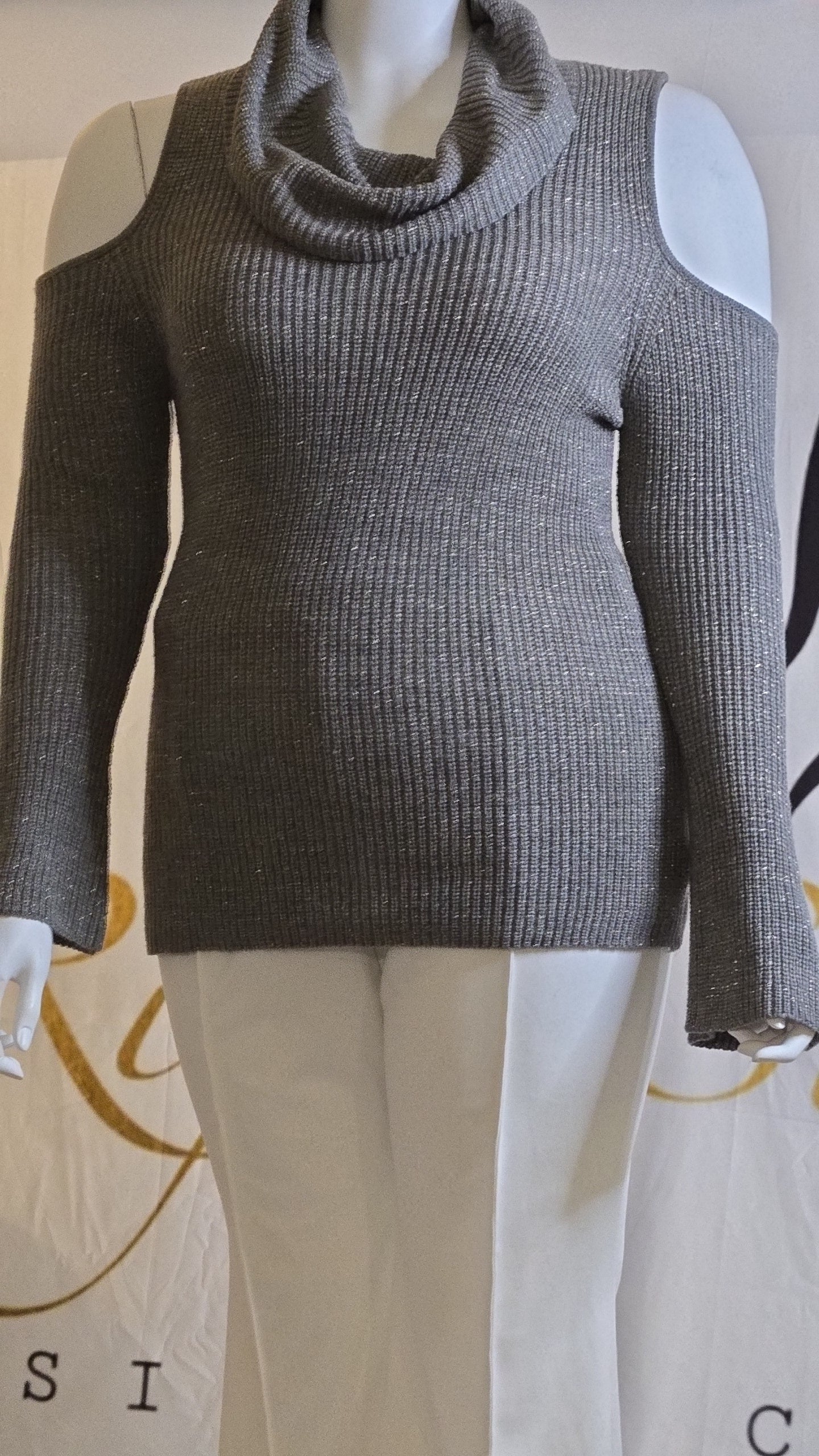 This charming sweater features a flattering cowl neck and eye-catching peek-a-boo sleeves. Subtle glitter accents add a touch of sparkle to this versatile piece. The soft fabric and comfortable fit make it perfect for any occasion. This stylish sweater is sure to become a favorite in your wardrobe. Comes in 2 colors.