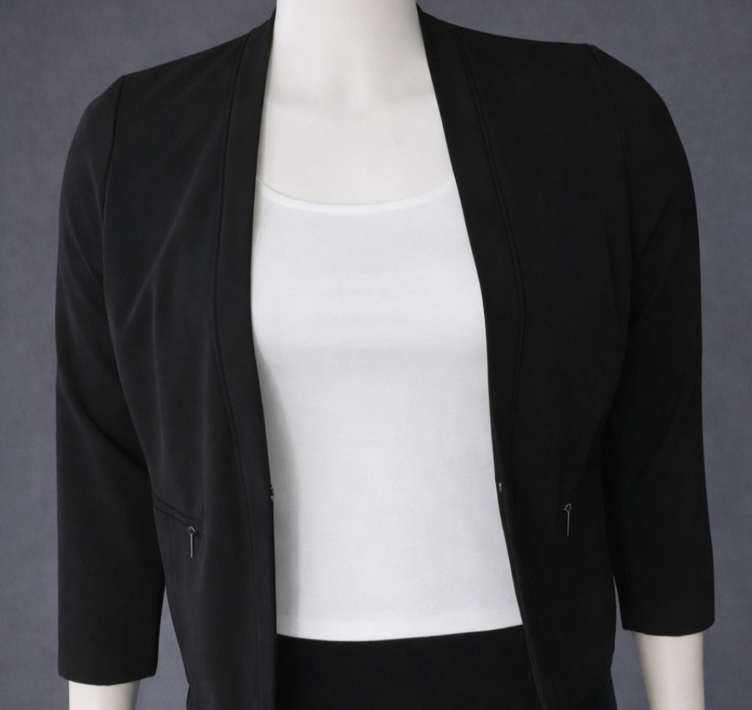 Timeless, polished, and effortlessly versatile, this black tailored jacket is the ultimate layering piece for a refined, put together look. Designed with a clean, collarless silhouette, it delivers a modern, streamlined style that works beautifully for both professional and dressy occasions.