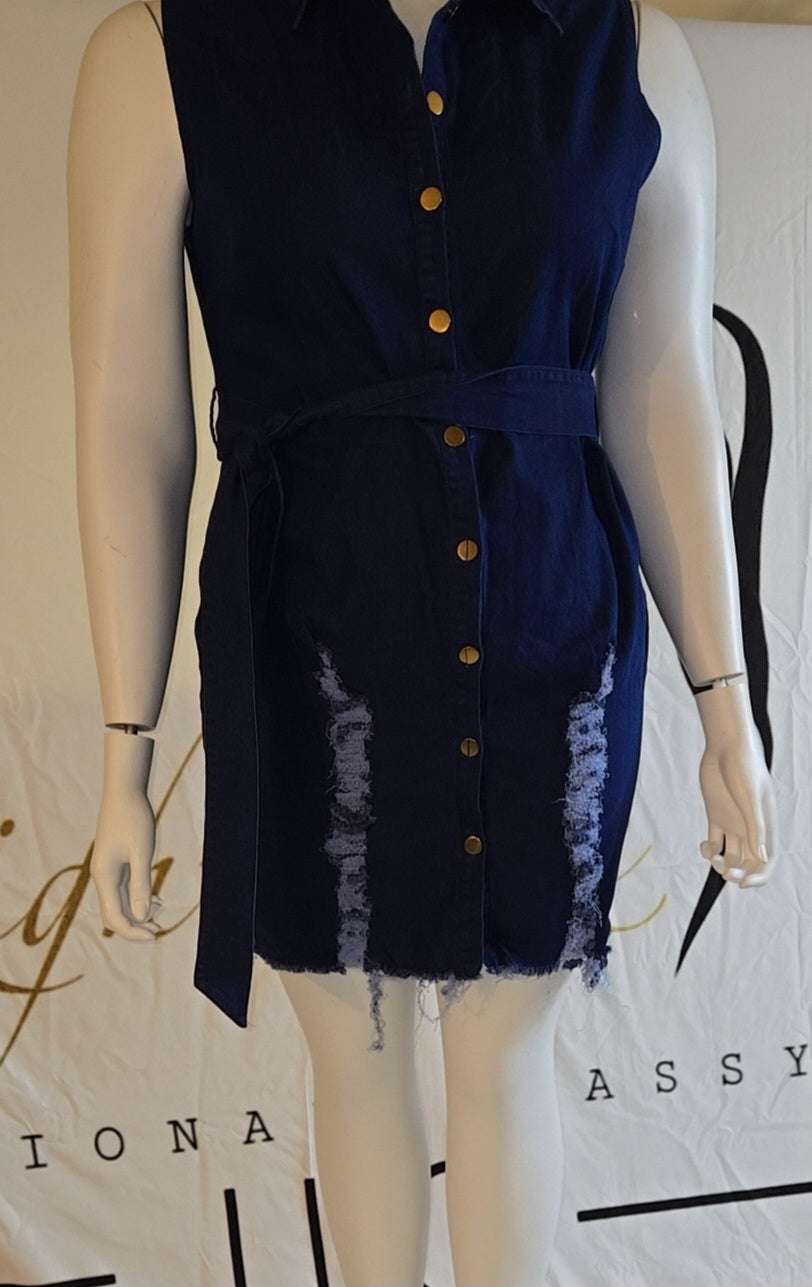 This sleeveless button up, belted distressed denim dress isver chic and stylish.This sleeveless button-up, belted, distressed denim dress is very chic and stylish. The sleeveless design keeps you cool on warm days, while the buttons allow for adjustable styling. A belt cinches the waist to create a flattering silhouette. The distressed denim adds a touch of edgy coolness. This versatile dress can be dressed up or down for any occasion.