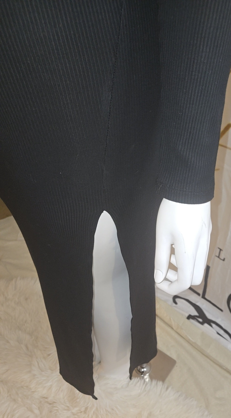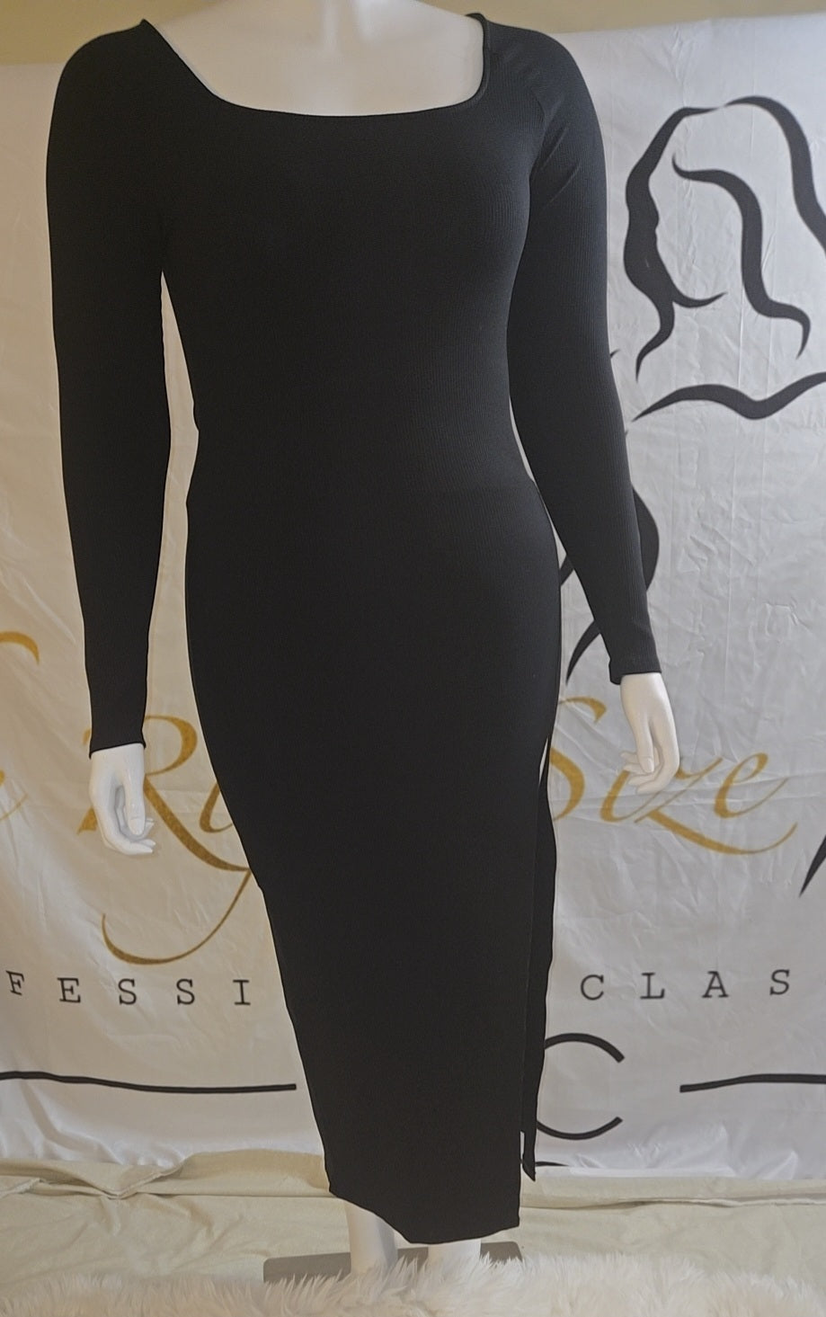 Ribbed sweater body con maxi dress. High side split. Long sleeve. The ribbed knit fabric of this maxi dress accentuates the body's natural curves. A high side split adds a touch of allure and allows for easy movement. Long sleeves provide coverage and warmth, making it suitable for various occasions. The sweater material offers comfort and a flattering drape. This versatile piece can be dressed up or down with ease.